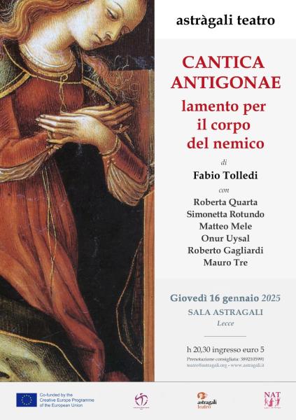 Prende il via giovedì 16 gennaio 2025, alle 20.30, nella sede di Astràgali Teatro a Lecce, con lo spettacolo “Cantica Antigonae. Lamento per il corpo del nemico”, il progetto internazionale NAT- Nature Arts Technologies dell’International Threatre Institute – ITI Italia, il Centro Italiano dell’ITI UNESCO.L’operaèla nuova produzione scritta e diretta da Fabio Tolledi e interpretata da Roberta Quarta, Simonetta Rotundo, Matteo Mele, Onur Uysal, con le musiche dal vivo eseguite da Mauro Tre e da Roberto Gagliardi.