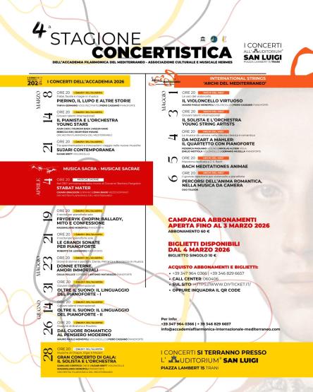Dall’8 febbraio al 28 giugno 2026, l’Auditorium S. Luigi ospita la 4ª Stagione Concertistica “I Concerti dell’Accademia” - International String – Archi del Mediterraneo – Musicae Sacrae, un percorso di 16 concerti che invita il pubblico a vivere la musica non solo come spettacolo, ma come esperienza profonda.